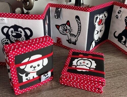 Kontrastní leporela, muchláčky, didaktické kostky i quiet booky. Různé typy taštiček na mobily, drobnosti, kosmetiku. Batohy rolovací, na zip, nebo na stažení. Kabelky podle vašeho výběru. Ukázky výrobků najdete na instagramu nebo v jednotlivých skupinách zde, na stránce.